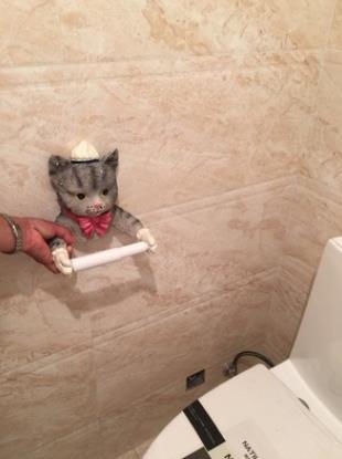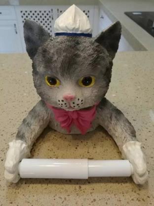 The toilet paper holder has housekeeper cat design, that is composed of environmental resin material, that is solid and hard, this toilet paper holder is not easy to be out of shape, that is easy to be cleaned.