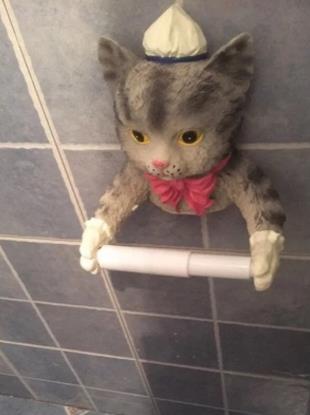 The toilet paper holder is made of resin material, that is hand made, style is exquisite and vivid, that is equipped with third dimension, that reflects country atmosphere. This toilet paper holder is made by rustic style, the housekeeper cat is cute in its shape and color, that brings much atmosphere for house.